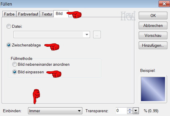 11. Öffne den *farbverlauf* aus dem Material, einfärben in deiner HG-Farbe, Rechtsklick -- Kopieren, Bearbeiten -- Füllen, siehe Screen